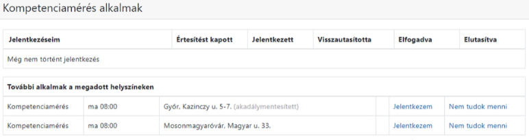 Kompetenciamérésre való jelentkezéshez a megfelelő alkalom melletti „Jelentkezem” feliratra kell kattintani. Ha egy vagy több kompetenciamérési alkalomról már az alkalom megjelenésekor tudja, hogy nem tud rajta részt venni, kérjük, jelölje a „Nem tudok menni” linkre kattintással. Ez esetben az ügyintézők nem fognak tájékoztatót küldeni az adott eseményről.